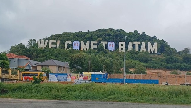 Batam - Pemasangan spanduk Prabowo Subianto-Gibran Rakabuming Raka di monumen Welcome To Batam mengganggu wisatawan. Fotografer keliling kehilangan pendapatan.