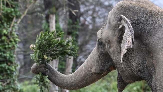 Seekor gajah Asia bermain dengan pohon Natal saat acara pemberian makan pohon Natal tahunan di Kebun Binatang Berlin, di Berlin, Kamis 4 Januari 2024. Ada yang berbeda pada menu gajah dan beberapa penghuni Kebun Binatang Berlin, yakni pohon Natal.