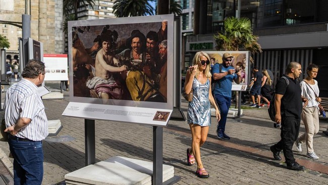Replika mahakarya termasuk, The Triumph of Bacchus karya Diego Velazquez, dipamerkan dalam pameran luar ruangan yang diselenggarakan oleh Museum Prado, di pusat kota Montevideo, Uruguay, Selasa, 9 Januari 2024. Pengunjung nampak antusias melihat karya seni tersebut.