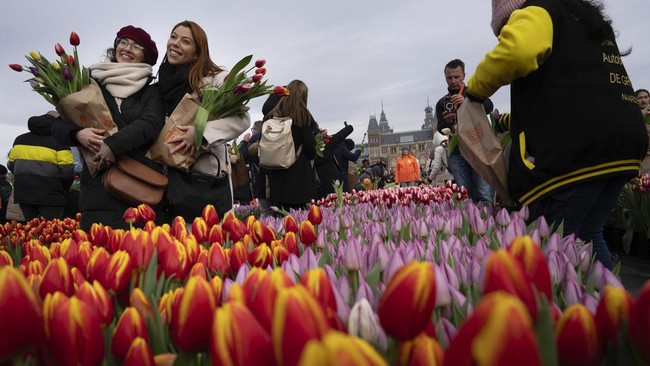 Ribuan orang memetik bunga tulip gratis pada hari tulip nasional yang menandai dibukanya musim tulip 2024 di Museum Square di Amsterdam, Belanda, Sabtu (20/1/2024).