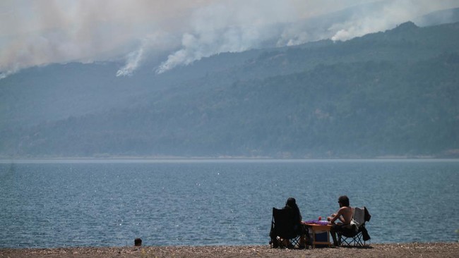 Dua turis memandangi asap yang mengepul dari Taman Nasional Los Alerces, Chubut, Argentina, Minggu (28/1/2024).