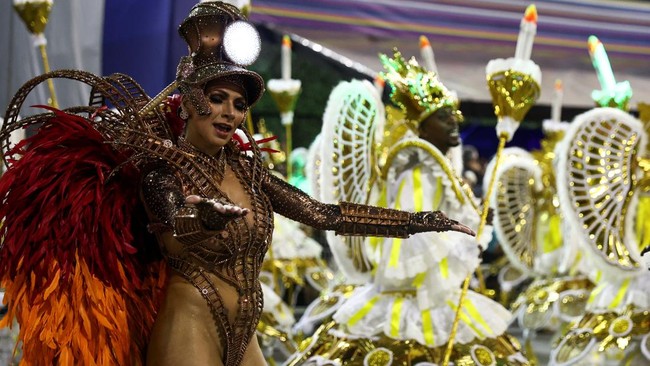 Penari dari sekolah Mocidade Alegre tampil pada malam kedua parade Karnaval di Anhembi Sambadrome di Sao Paulo, Brasil (11/2/2024). REUTERS/CARLA CARNIEL