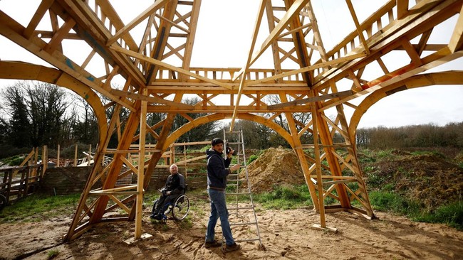 Prancis - Dua sahabat di Prancis barat membangun replika Menara Eiffel dari kayu daur ulang. Mereka berharap karya itu bisa dipajang di jalur estafet obor Olimpiade 2024.