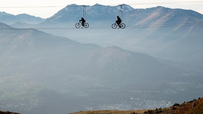 Wisatawan mengendarai 'Zippy Bike' dengan zipline pada hari musim dingin yang sejuk di resor ski Hautacam di Beaucens, Hautes-Pyrenees, barat daya Prancis, 20 Februari 2024. Kurangnya salju yang berulang memaksa resor ski Pyrenees Prancis mencari alternatif.