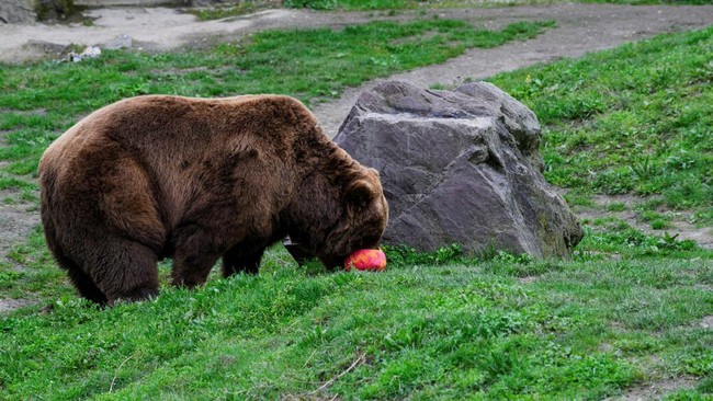 Seekor beruang Kamchatka terlihat berburu telur paskah di kebun binatang Gelsenkirchen, Jerman, Rabu (27/3/2024).