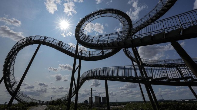 Bangunan tersebut berada di Kota Duisburg, Jerman yang bernama Tiger & Turtle - Magic Mountain. Pembuatnya adalah dua orang seniman ternama Jerman asal Hamburg, Heike Mutter dan Ulrich Genth. (AP Photo/Martin Meissner)