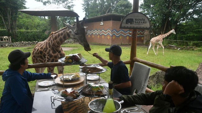Bogor - Wisata makan bersama jerapah menjadi destinasi favorit di Bogor. Wisata ini juga memberikan pengalaman baru bagi pengunjung dalam mengisi libur Lebaran.