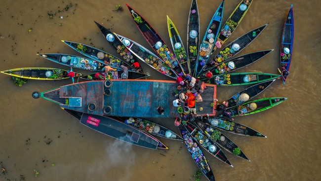 Foto udara sejumlah pedagang menjajakan dagangannya di atas perahu (jukung) di Pasar Terapung Lok Baintan, Kabupaten Banjar, Kalimantan Selatan, Kamis (18/4/2023).