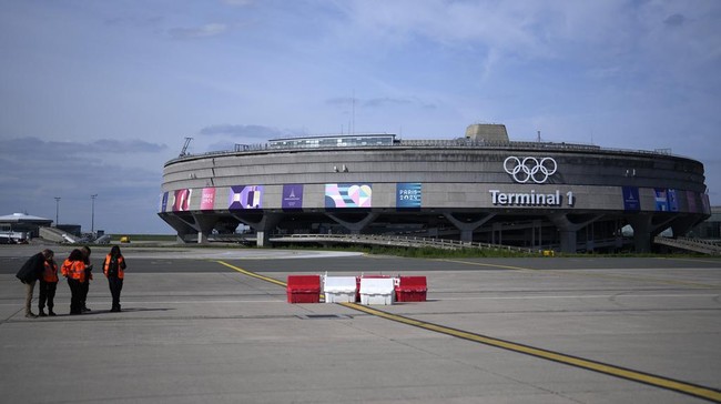 Bandara Charles de Gaulle, terminal 1, tempat pemasangan cincin olimpiade, terlihat di Roissy-en-France, utara Paris, Selasa (23/4/2024). Langit di atas wilayah Paris akan ditutup selama enam jam sebagai bagian dari operasi keamanan besar-besaran untuk upacara pembukaan Olimpiade pada 26 Juli.