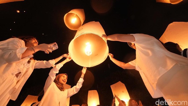 Magelang - Ribuan orang antusias mengikuti pelepasan lampion saat Wasiak 2568 di Candi Borobudur. Acara itu berlangsung meriah.