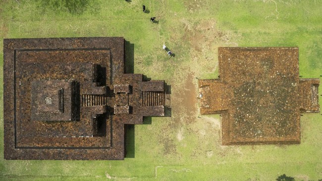 Foto udara pengunjung berada di areal dalam Candi Gumpung, Kawasan Cagar Budaya Nasional (KCBN) Muara Jambi, Muaro Jambi, Jambi, Selasa (18/6/2024).