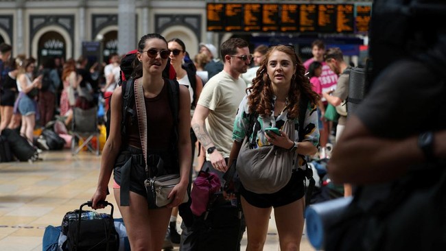 Orang-orang berjalan naik kereta untuk Festival Glastonbury, di Stasiun Paddington di London, Inggris, Rabu (26/6/2024). REUTERS/Isabel Infantes