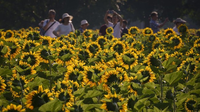 Pemandangan bunga-bunga matahari yang bermekaran di sebuah Taman Hutan Olimpiade di Beijing, China, Rabu (3/7/2024).