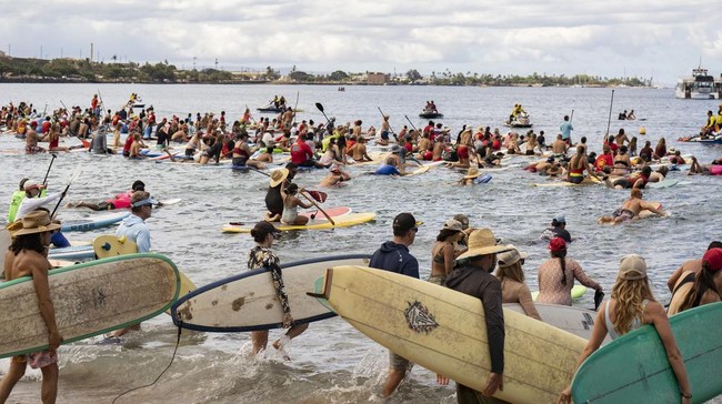 Aksi Mendayung-Berselancar Peringati Satu Tahun Kebakaran Hawaii