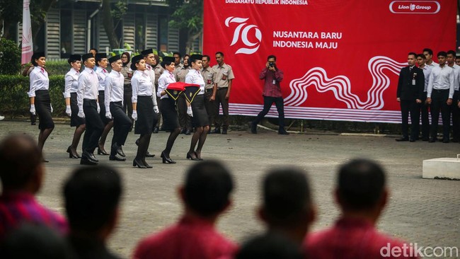 Banten - Lion Group menggelar upacara HUT ke-79 RI di Banten, Sabtu (17/8). Mulai dari satpam, pramugara, pramugari, hingga kapten pilot mengikuti upacara tersebut.