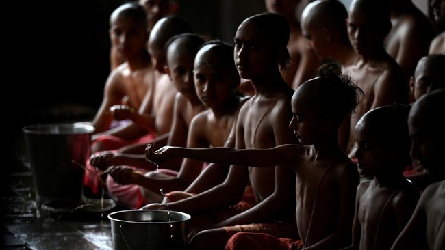 Umat Hindu menjalani ritual mandi untuk menandai festival Janai Purnima (Festival Benang Suci) di Kuil Pashupatinath di Kathmandu, Nepal, Senin (19/8/2024).