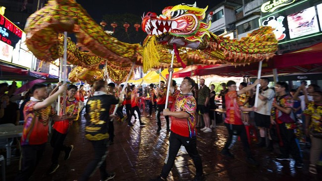 Pertunjukan tari naga di Festival Hantu Kelaparan Tiongkok di Kuala Lumpur, Malaysia, Senin (19/8/2024). Festival ini dirayakan pada bulan ketujuh kalender lunar Tiongkok.