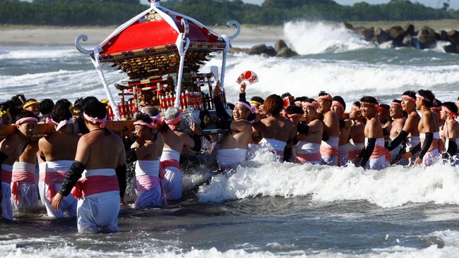 Jepang - Warga Jepang menggelar Festival Ohara Hadaka. Dalam festival itu mereka melarungkan kuil Mikoshi ke laut untuk berdoa hasil panen terbaik.