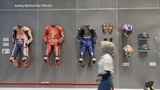 Pengunjung berjalan di dekat baju balap MotoGP yang dipajang di museum MotoGP di Pertamina Mandalika International Street Circuit, Kuta, Praya, Lombok Tengah, NTB, Minggu (29/9/2024).
