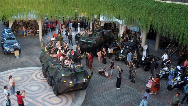 Puluhan pengunjung menaiki kendaraan tempur TNI AD saat Pameran Alutsista yang digelar di salah satu mal di Denpasar, Bali, Kamis (24/10/2024).