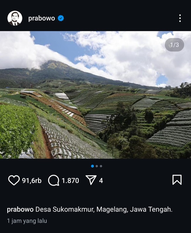Presiden Prabowo Subianto memboyong Kabinet Merah Putih ke Lembah Tidar, Magelang dalam agenda retreat. Di sela hal itu, ia terlihat memposting spot wisata di Magelang. Di sela kunjungannya kembali ke Magelang, Prabowo terlihat mengunggah salah satu destinasi hidden gems di Magelang. Ia mengunggah lanskap panorama Desa Sukomakmur yang dikenal sebagai "Negeri Sayur Sukomakmur". (Dok. Instagram/prabowo)