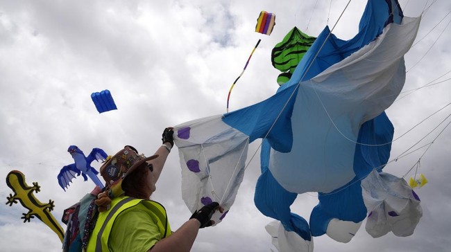 Para peserta menerbangkan layang-layang di Festival Layang-Layang Internasional Cape Town di Cape Town, Afrika Selatan, Minggu (27/10/2024).