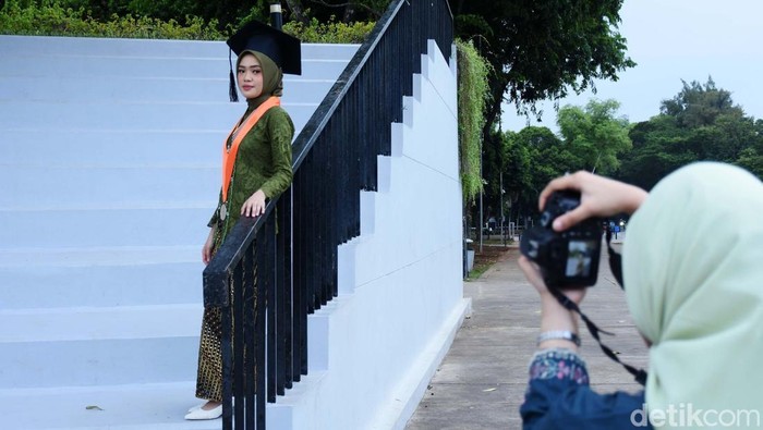 Jakarta - Lapangan Banteng jadi lokasi favorit foto wisuda di Jakarta. Sebab taman ini menawarkan latar ikonik dengan suasana estetik dan khas kota.