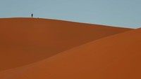 Seorang pria berdiri di puncak bukit pasir di gurun pasir Erg Chebbi.