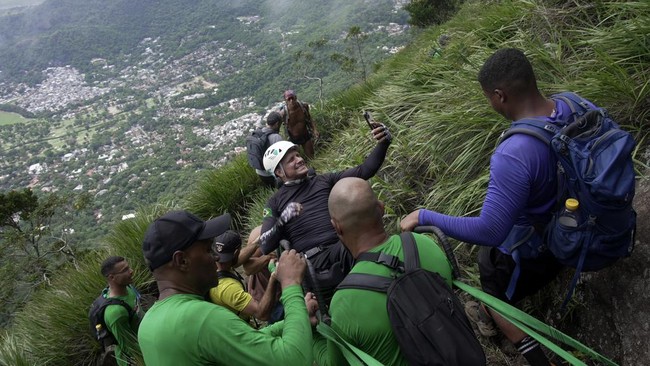 Brasil - Ezequiel da Luz, seorang atlet disabilitas, diajak mendaki gunung granit Pedra da Gavea. Pria dengan kursi rodanya itu dibantu team sampai mencapai puncak.