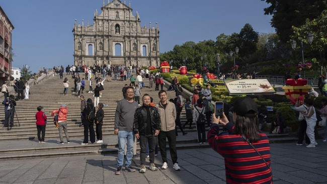 Pengunjung berfoto di depan Reruntuhan St. Paul menjelang perayaan ulang tahun ke-25 penyerahan Makau ke pemerintahan China, di Makau, Kamis (19/12/2024). (AP Photo/Anthony Kwan)