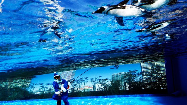 Tokyo - Penyelam mengenakan pakaian Sinterklas biru berenang bersama penguin di Jepang. Atraksi itu untuk edukasi dan memeriahkan liburan Natal.