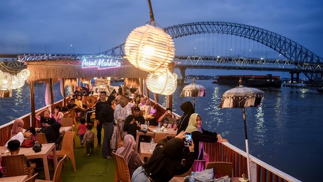 Sejumlah wisatawan duduk di geladak atas Kapal Pesut Mahkota saat susur Sungai Mahakam di Samarinda, Kalimantan Timur, Kamis (26/12/2024).