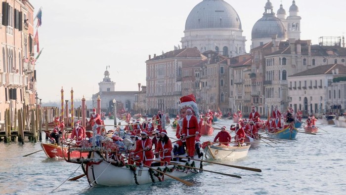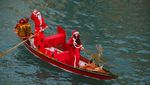 Italia - Para Sinterklas menukar kereta luncur mereka dengan gondola, membawa keceriaan liburan ke Kanal Besar Venesia. Begini potretnya.