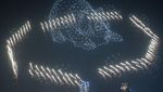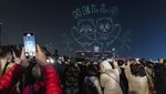 Selama bagian tertentu dari tontonan itu, beberapa drone menampilkan kembang api, sementara ratusan lainnya membentuk panda tiga dimensi yang berputar perlahan di langit. Β