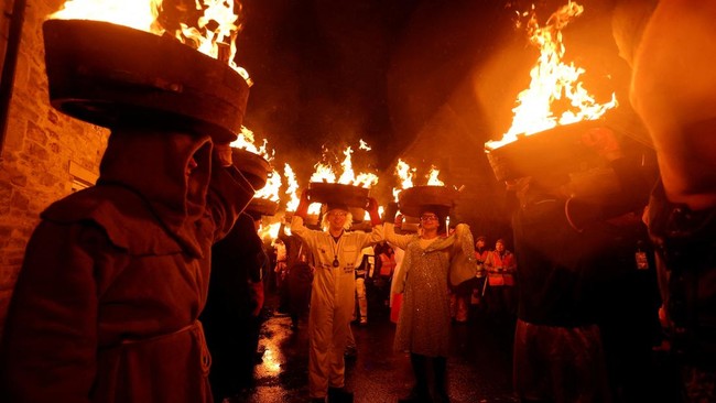 Inggris - Festival Tar Barrel Allendale digelar untuk menyambut Tahun Baru 2025 di Allendale, Inggris. Peserta membawa tong dan kayu bakar untuk dibakar dalam api unggun.