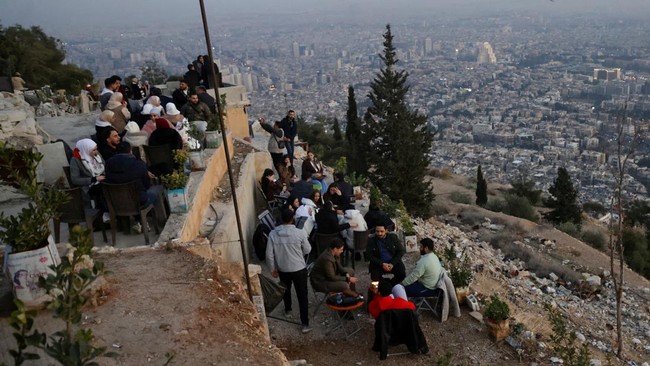 Orang-orang berkumpul pada Selasa (7/1) di Gunung Qasioun di Damaskus, menghisap sheesha, menyantap makanan ringan, dan menikmati tempat nongkrong yang hanya mereka ingat dari beberapa tahun yang lalu.