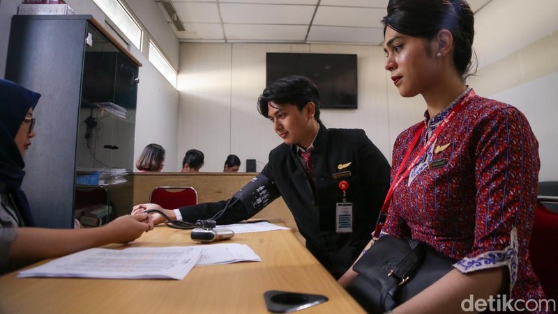 Pemeriksaan kesehatan ini mencakup tes tekanan darah dan tes kadar alkohol. Awak kabin harus nol kadar alkohol sebelum lepas landas.