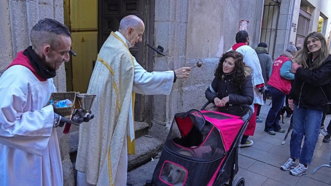 Spanyol - Puluhan pemilik hewan peliharaan membawa hewan peliharaan mereka ke gereja di Spanyol. Mereka antre untuk menerima berkat ilahi pada hari raya santo pelindung.