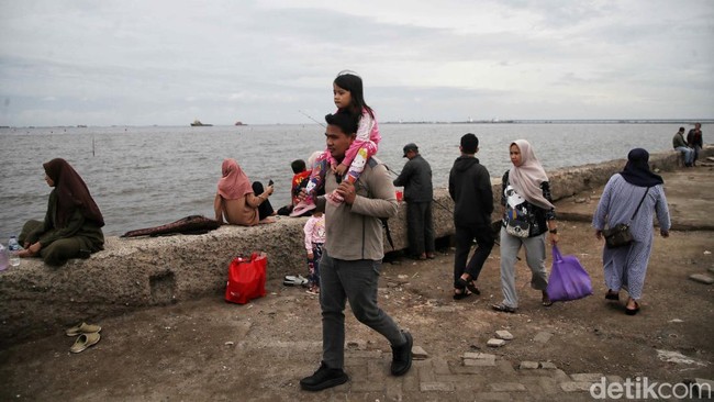 Jakarta - Libur panjang ini dimanfaatkan warga untuk berwisata. Sejumlah warga memilih liburan murah meriah di Pantai Marunda, Jakarta Utara.