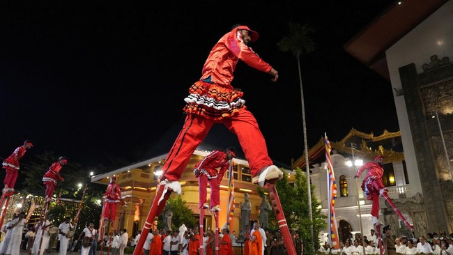 Ibu kota Sri Lanka, Kolombo, menjadi hidup pada hari Selasa (11/2) dengan suara genderang dan lampu warna-warni, saat orang banyak berkumpul untuk menyaksikan gajah-gajah agung dan para pemain menari di jalanan.