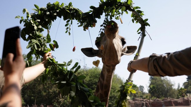 Seekor jerapah memakan daun berbentuk hati sebelum Hari Valentine di Buinzoo Biopark di Santiago, Chile, Kamis (13/2/2025).
