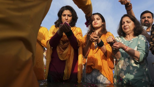 Aktor Bollywood Raveena Tandon, kiri, bersama putrinya Rasha Thadani, tengah, melakukan ritual mandi di pertemuan sungai Gangga, Yamuna, dan Saraswati, selama festival Maha Kumbh Mela di Prayagraj, India, Selasa (25/2/2025).