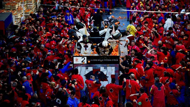 Italia - Kota Ivrea di Italia utara merayakan Karnaval dengan tradisi yang paling menggembirakan. Tradisi tersebut yakni perang jeruk. Begini potretnya.