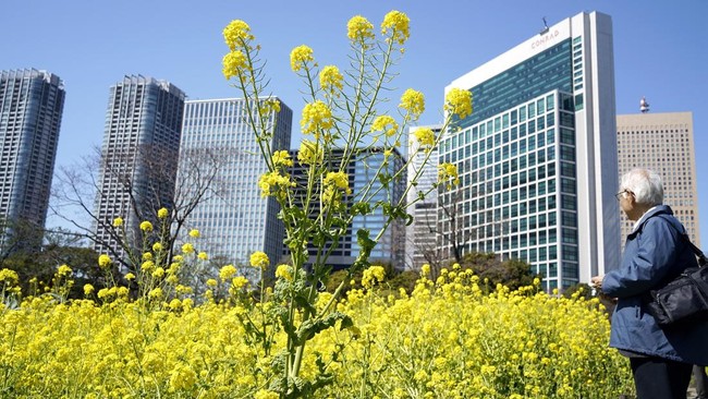 Tokyo - Ladang bunga rapeseed di Taman Hamarikyu di Tokyo, Jepang, sedang bermekaran. Keindahannya langsung diburu sejumlah warga.