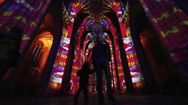 Inggris - Kolaborasi seni Luxmuralis menggelar instalasi cahaya dan suara di Katedral Winchester. Katedral ini merupakan tempat dimakamkamnya penulis Jane Austen.