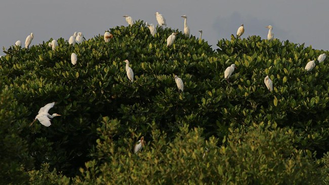 Foto udara sejumlah burung kuntul (Egretta garzetta) berada di atas pohon bakau kawasan pesisir Desa Lambada Lhok, Aceh Besar, Aceh, Rabu (19/3/2025).