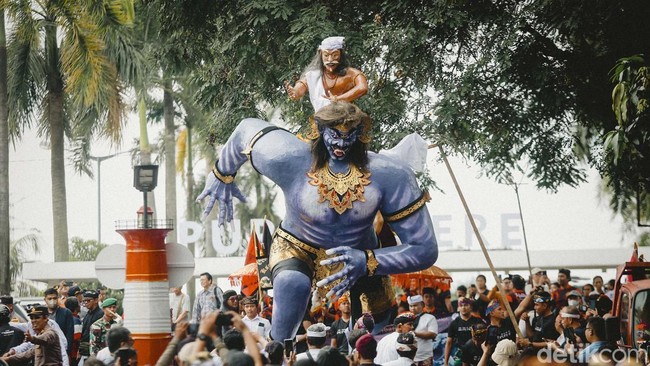 Depok - Pawai ogoh-ogoh digelar di Cinere, Depok, Jumat (28/3). Pawai yang menampilkan lima ogoh-ogoh itu digelar dalam rangka memperingati Hari Raya Nyepi 2025.