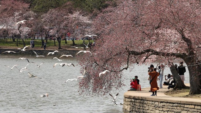 Pohon sakura Yoshino yang ikonik di sepanjang Tidal Basin, Washington, DC, mekar penuh pada hari Jumat (28/3), menarik banyak pengunjung ke tradisi yang dikaitkan dengan awal musim semi di ibu kota AS tersebut. REUTERS/Kevin Lamarque