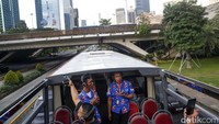 Serunya Keliling Jakarta Naik Bus Tingkat Tanpa Atap Saat Libur Lebaran BAGIKAN URL telah disalin Wisatawan antre untuk menaiki bus wisata Open Top Tour of Jakarta di Jalan Jenderal Sudirman, Jakarta, Jumat (4/4/2025). Pemandu wisata memberikan pengenalan dan arahan kepada wisatawan sebelum menaiki bus. Jalan-jalan menaiki bus wisata Jakarta jadi pilihan beberapa warga untuk mengisi waktu libur Lebaran. Beberapa warga sengaja ingin jalan-jalan menggunakan bus wisata Jakarta bertingkat untuk melihat sisi lain kota Jakarta. Wisata bus dengan rute yang melewati landmark Kota Jakarta menjadi salah satu pilihan menarik warga untuk mengisi waktu libur Lebaran. Pengunjung bisa berfoto dengan latar suasana kota yang ikonik. Layanan bus tingkat tanpa atap ini menawarkan pengalaman wisata yang berbeda, terutama saat sore dan malam hari. Wisatawan dapat menikmati keindahan ikon kota dan gedung-gedung pencakar langit Jakarta sembari menjelajahi destinasi wisata populer ibu kota. Atraksi wisata ini merupakan bagian dari upaya pemerintah mendukung visi Jakarta sebagai kota global yang modern, kreatif, dan ramah wisatawan.