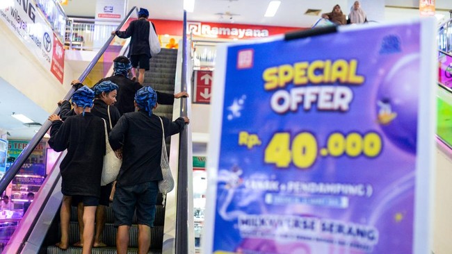 Serang - Warga Suku Badui terlihat tengah berkeliling mal di Serang, Banten. Mereka memanfaatkan waktu luang jelang tradisi seba untuk belanja kebutuhan pribadi.